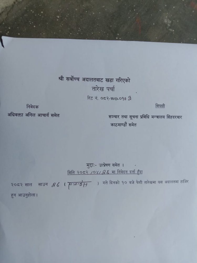 अधिवक्ता अनिल आचार्य, ‘कानून खबर’ का प्रधान सम्पादक सुमन कुमार लुइटेल, र ‘बिड मिडिया’ का अध्यक्ष बिकल गिरीले संयुक्त रूपमा दायर गरेको रिटमा २०८२ साउन १४ गते राजपत्रमा प्रकाशित ‘नेपाल ऐन संशोधन गर्न बनेको ऐन, २०८२’ मार्फत छापाखाना तथा प्रकाशन सम्बन्धी ऐन, २०४८ मा थपिएको दफा ७(ख) खारेज गर्न माग गरिएको छ ।