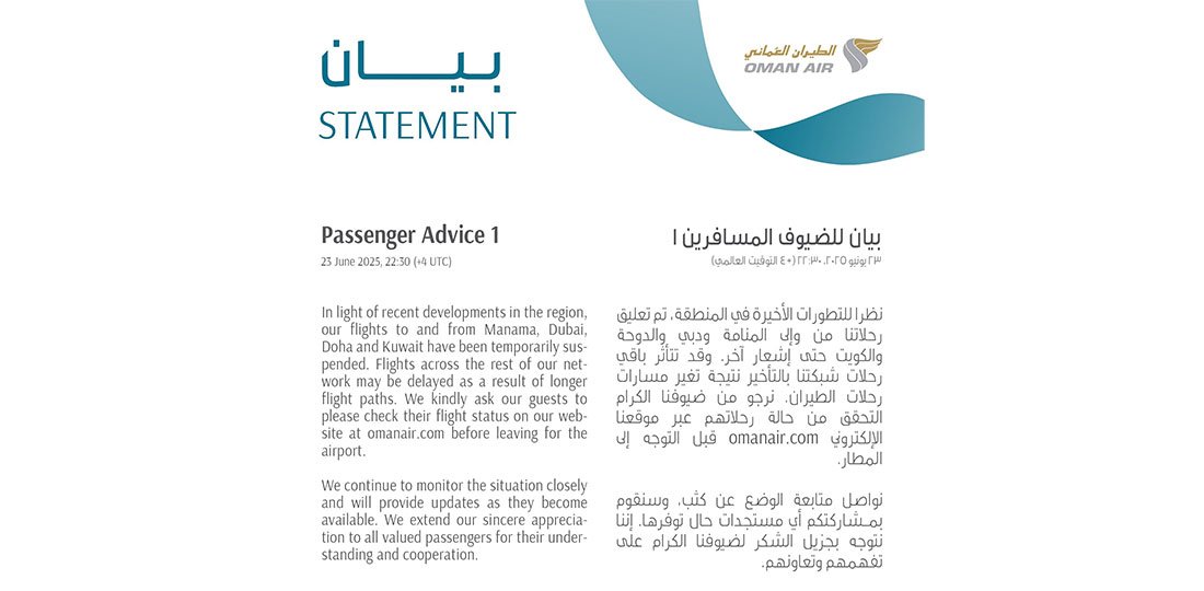 एयरले एक सूचना जारी गर्दै पछिल्लो क्षेत्रीय घटनाक्रमलाई ध्यानमा राख्दै मनामा, दुबई, दोहा र कुवेत जाने र त्यहाँबाट फर्किने सबै उडानहरू अस्थायी रूपमा स्थगित गरेको जानकारी दिएको हो । एयरलाइन्सका अनुसार अन्य गन्तव्यतर्फका उडानहरू पनि लामो मार्ग प्रयोग गर्नु पर्ने भएकाले ढिलो हुन सक्ने जनाएको छ।