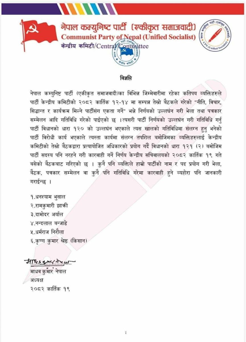 काठमाडाैँ । पार्टी अध्यक्ष माधवकुमार नेपालले निर्णय नमान्ने पार्टीका ६ नेतामाथि कारबाही गरेका छन् । हिजो बुधबार काठमाडौंमा आयोजित एक कार्यक्रमका बीच नेकपा माओवादी केन्द्र, नेकपा एकीकृत समाजवादीसहितका १० दलको एकता भएको थियो । सोही दिनको मिति राखेर नेकपा एकीकृत समाजवादीका महासचिव घनश्याम भुसालसहितका ६ जना नेतालाई अध्यक्ष नेपालले कारबाही गरेको उल्लेख गरेका छन् ।