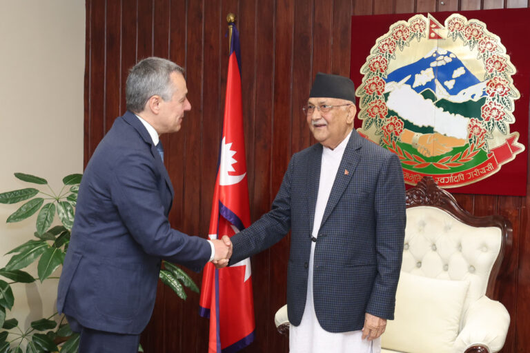 काठमाडौँ । प्रधानमन्त्री केपी शर्मा ओलीसँग स्विट्जरल्यान्डका सङ्घीय विदेशमन्त्री इग्नाजिओ डानियल जिओभान्नी क्यासिसले आज शिष्टाचार भेट गरेका छन् ।