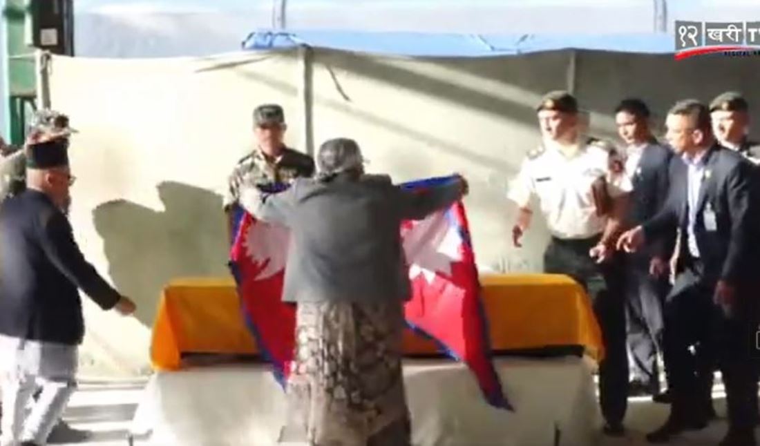 काठमाडौं । प्रधानमन्त्री सुशीला कार्कीले इजरायलमा मारिएका विपिन जोशीको शवमा राष्ट्रिय झण्डा ओढाएर श्रद्धाञ्जली अर्पण गरेकी छन् ।