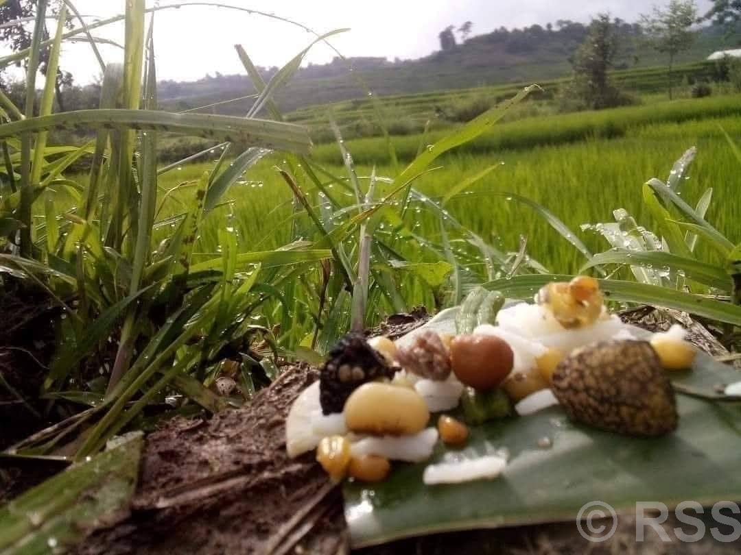भक्तपुर । गोलाकार पारेर काटिएका मूलाका चानालाई सिन्काले घोचेर डल्लो र अली लाम्चो बनाइएको भातमा अड्याइएको छ। छरिता रोटीसँगै क्वाँटीलगायत विभिन्न तरकारी र खानेकुरा एउटा ठूलो पातमाथि राखिएका छन्। त्यही पातलाई नाङ्लो वा किस्तीमाथि राखेर रक्षाबन्धन धागो र सिन्दुरसमेत त्यसमै राखेर छेवैमा धुवाइरहेको सुगन्धित धूप बालेर यहाँका किसान खेतमा पुगेका छन्।